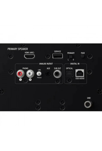 Акустическая система Klipsch The Nines собрана в хорошо демпфированном фазоинверторном корпусе из MDF. Корпус имеет встроенный в его тыльную часть порт фазоинвертора с выходной трубой в форме рупора Trastrix. Доступны два типа отделки (натуральный ореховый шпон или матово-черная поверхность). В верхнюю панель активной АС интегрированы два миниатюрных металлических «колеса» для настройки уровня громкости и выбора источника. В тыльную панель активной колонки встроена панель с набором коммутирующих разъемов, среди которых нужно выделить порт HDMI с поддержкой поворотного канала ARC, являющегося идеальным вариантом для подключения к ТВ-панели. Там же есть разъемы RCA, которые могут использоваться в двух вариантах – как обычный линейный вход или разъемы фонококтора. Выбор нужного варианта происходит посредством расположенного рядом механического переключателя.
